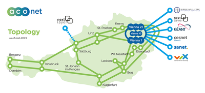 - Core PoPs: The routers at the core PoPs Vienna 1 and Vienna 21 are interconnected by two redundant fiber links with 200 Gbps in total. All other PoPs are connected to these two core routers, which also provide international connectivity for ACOnet's participants.